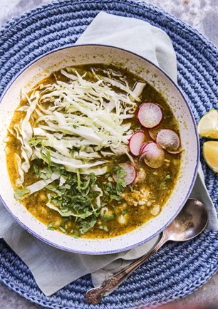 Homemade Pork Posole with all the fixings - lime, cabbage, onion, and chips - for ten, delivered to your home